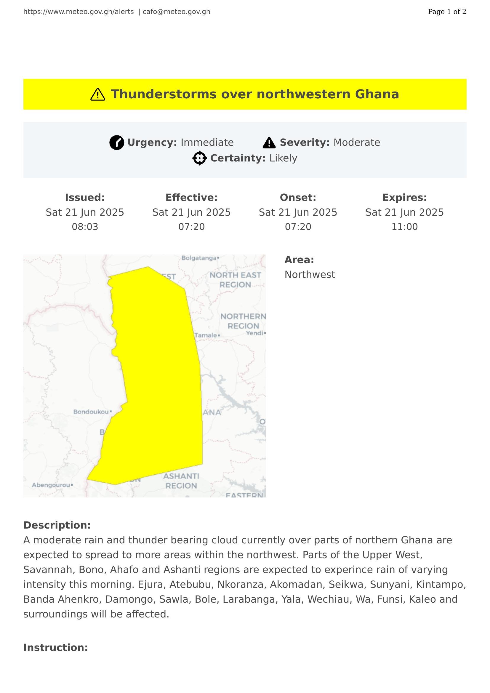 A moderate rain and thunder bearing cloud currently over parts of northern Ghana are expected to spread to more areas within the northwest. Parts of the Upper West, Savannah, Bono, Ahafo and Ashanti regions are expected to experince rain of varying intensity this morning. Ejura, Atebubu, Nkoranza, Akomadan, Seikwa, Sunyani, Kintampo, Banda Ahenkro, Damongo, Sawla, Bole, Larabanga, Yala, Wechiau, Wa, Funsi, Kaleo and surroundings will be affected.