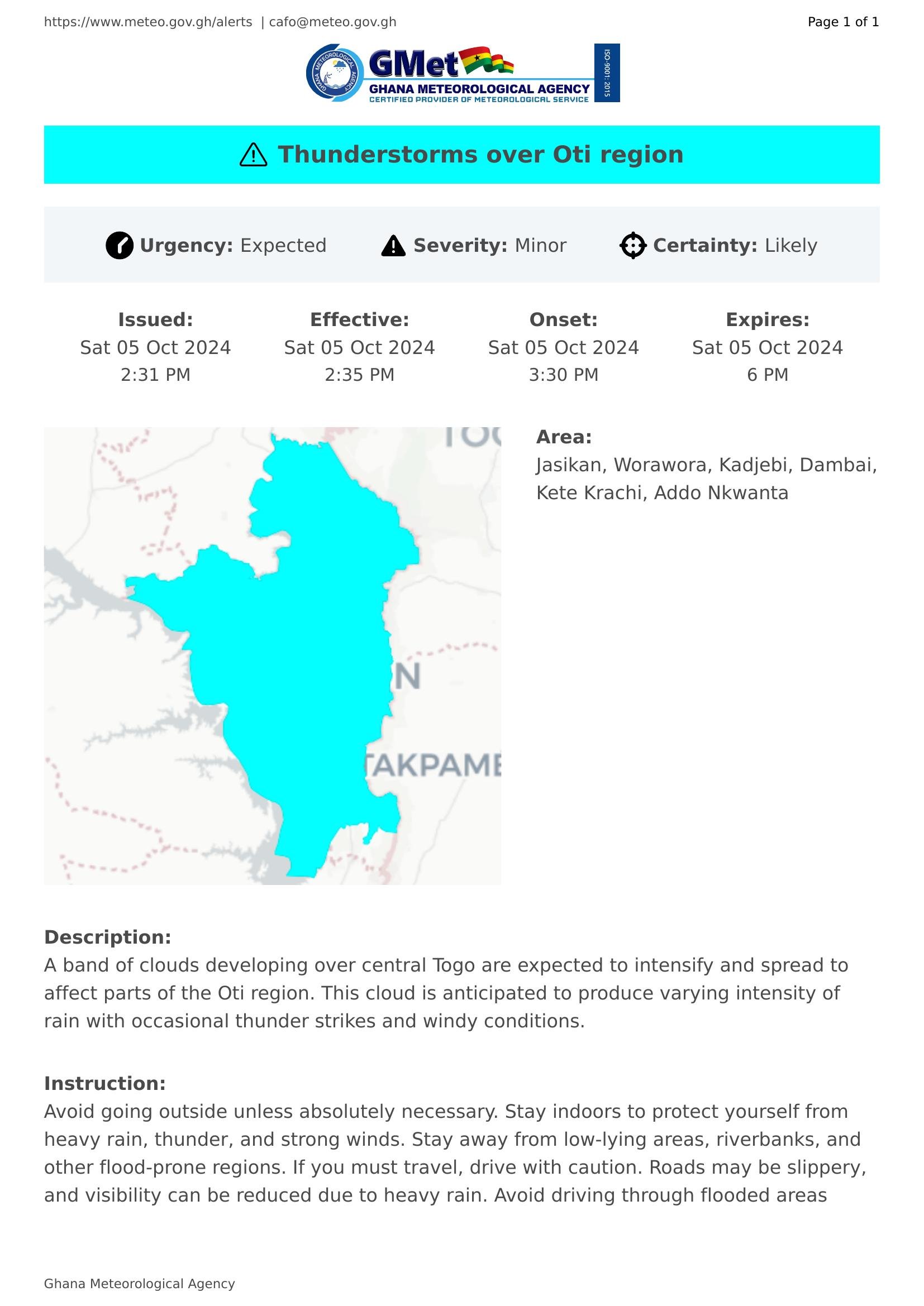 A band of clouds developing over central Togo are expected to intensify and spread to affect parts of the Oti region. This cloud is anticipated to produce varying intensity of rain with occasional thunder strikes and windy conditions.