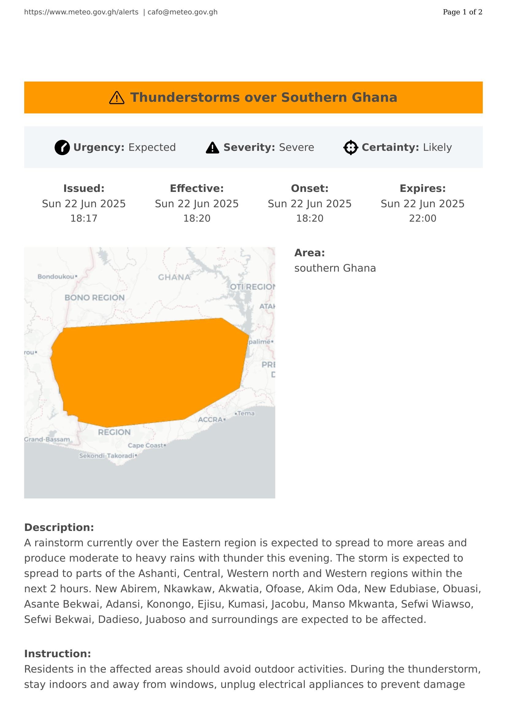 A rainstorm currently over the Eastern region is expected to spread to more areas and produce moderate to heavy rains with thunder this evening. The storm is expected to spread to parts of the Ashanti, Central, Western north and Western regions within the next 2 hours. New Abirem, Nkawkaw, Akwatia, Ofoase, Akim Oda, New Edubiase, Obuasi, Asante Bekwai, Adansi, Konongo, Ejisu, Kumasi, Jacobu, Manso Mkwanta, Sefwi Wiawso, Sefwi Bekwai, Dadieso, Juaboso and surroundings are expected to be affected.