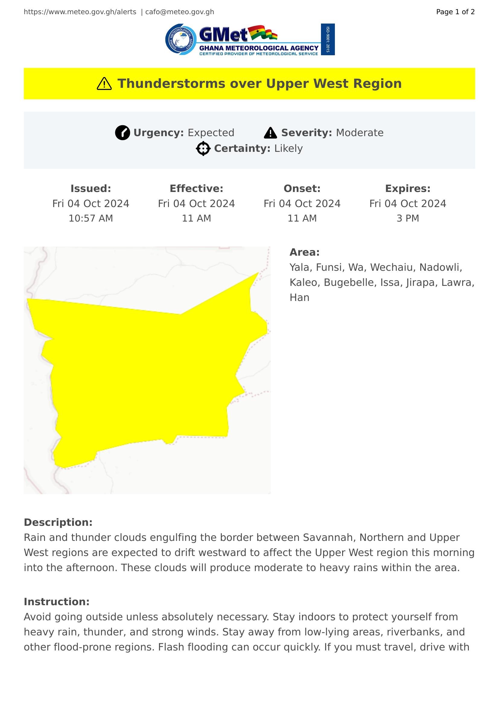 Rain and thunder clouds engulfing the border between Savannah, Northern and Upper West regions are expected to drift westward to affect the Upper West region this morning into the afternoon. These clouds will produce moderate to heavy rains within the area.