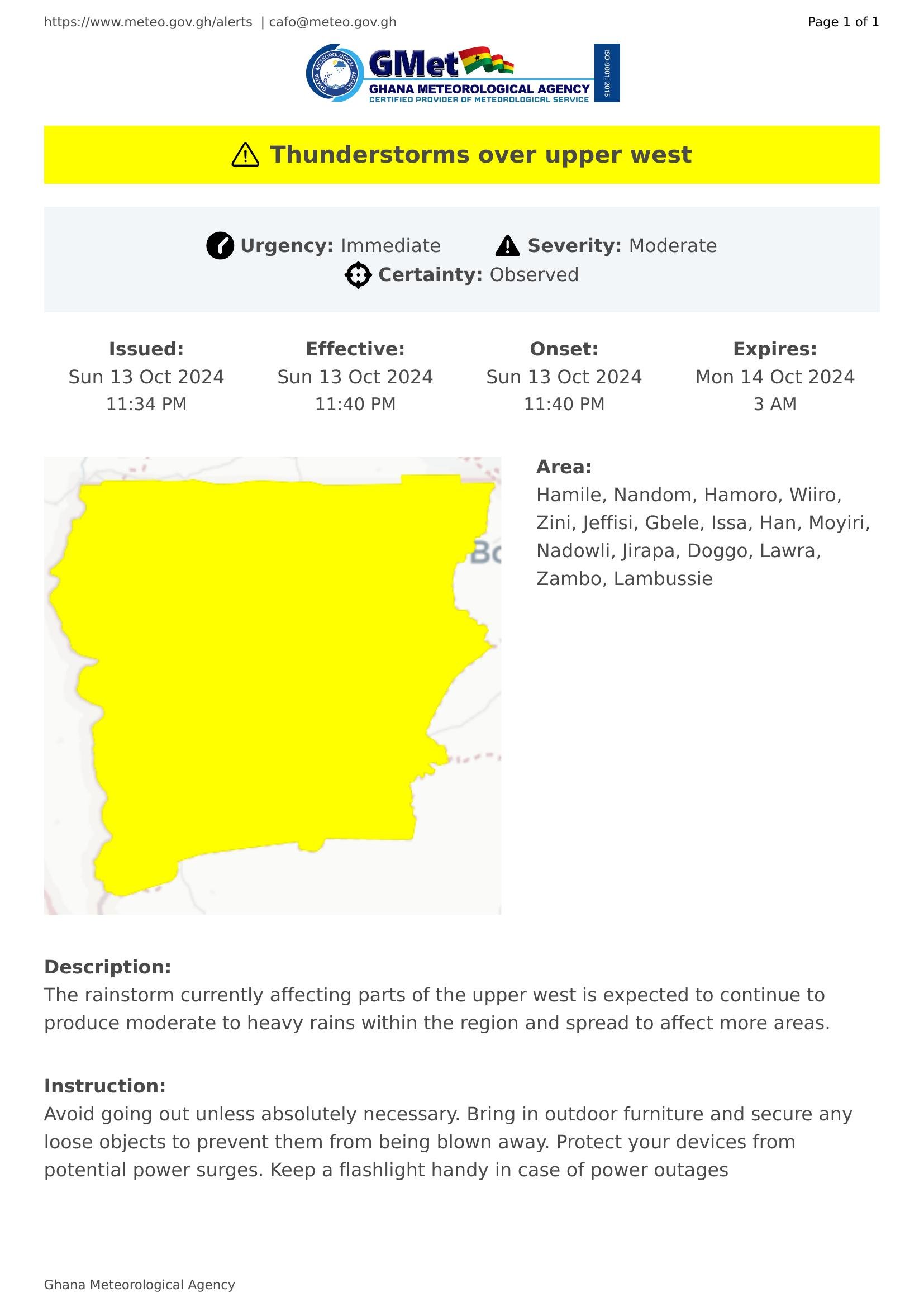 The rainstorm currently affecting parts of the upper west is expected to continue to produce moderate to heavy rains within the region and spread to affect more areas.