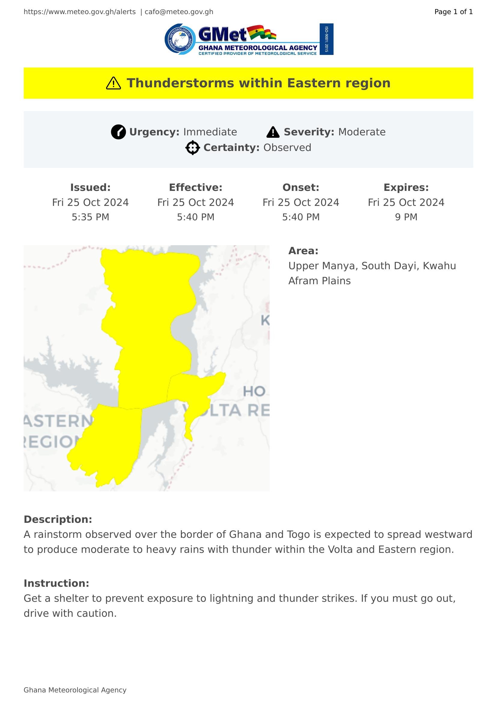 A rainstorm observed over the border of Ghana and Togo is expected to spread westward to produce moderate to heavy rains with thunder within the Volta and Eastern region.