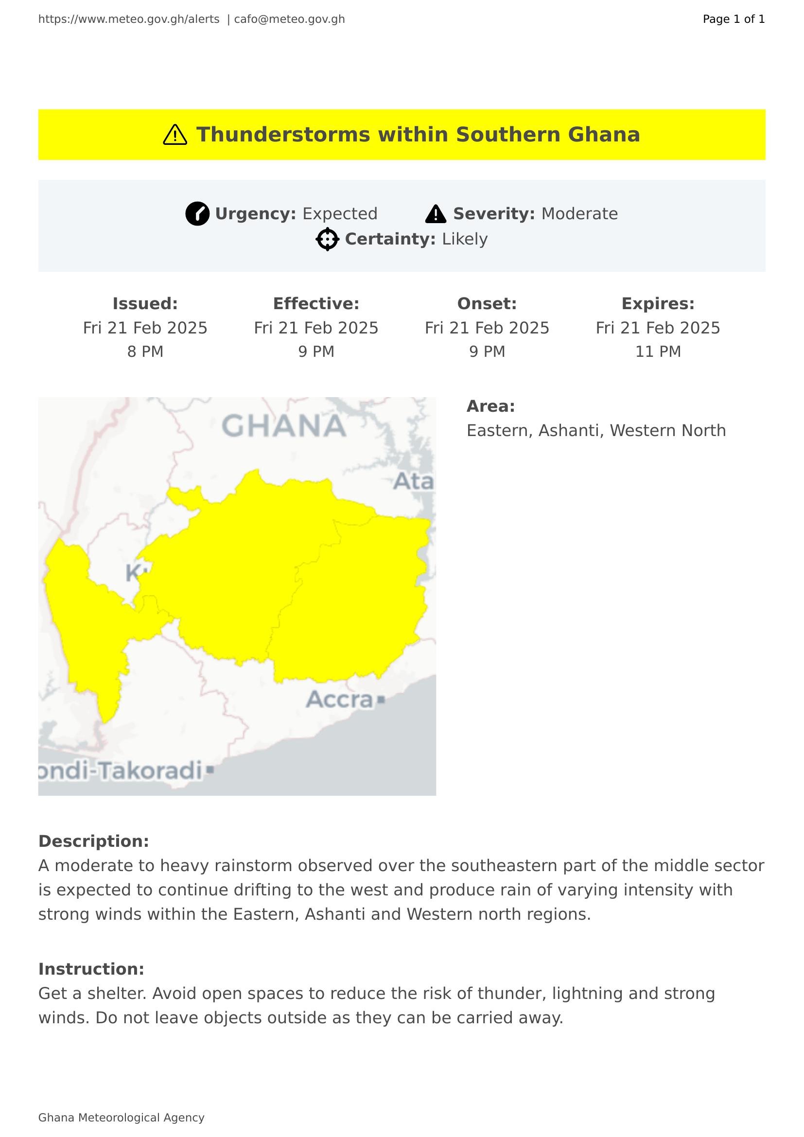 A moderate to heavy rainstorm observed over the southeastern part of the middle sector is expected to continue drifting to the west and produce rain of varying intensity with strong winds within the Eastern, Ashanti and Western north regions.