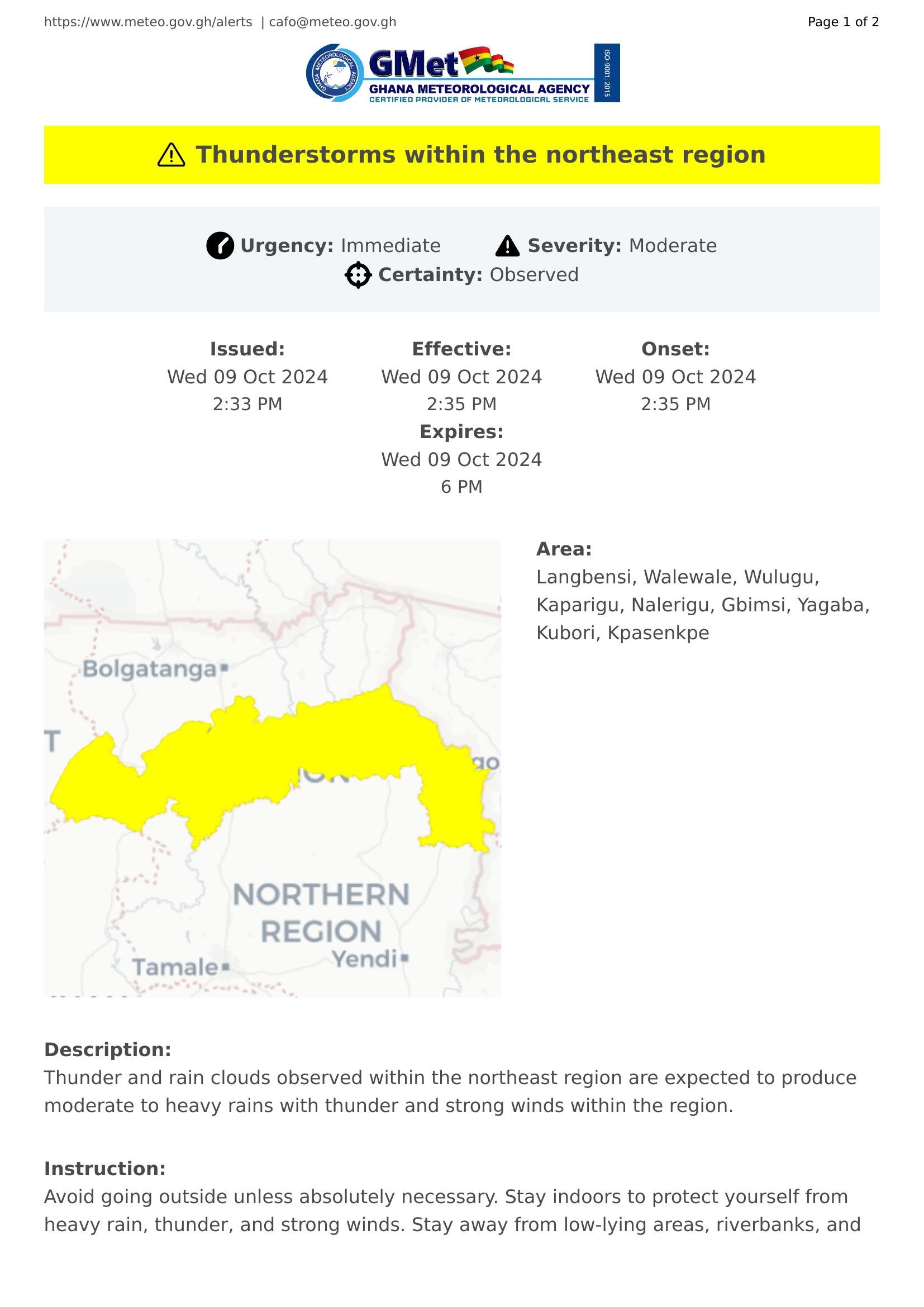 Thunder and rain clouds observed within the northeast region are expected to produce moderate to heavy rains with thunder and strong winds within the region.