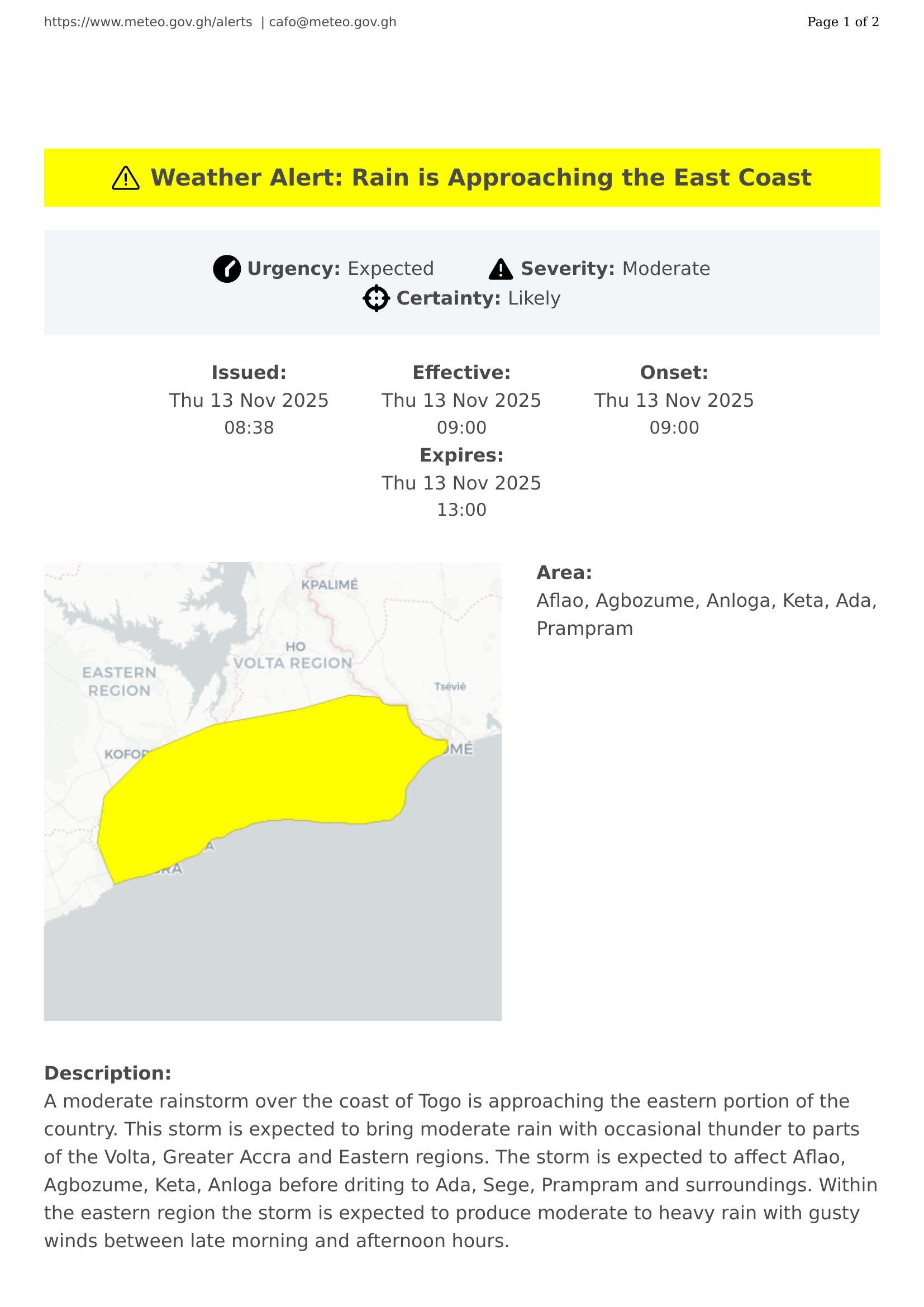 A moderate rainstorm over the coast of Togo is approaching the eastern portion of the country. This storm is expected to bring moderate rain with occasional thunder to parts of the Volta, Greater Accra and Eastern regions. The storm is expected to affect Aflao, Agbozume, Keta, Anloga before driting to Ada, Sege, Prampram and surroundings. Within the eastern region the storm is expected to produce moderate to heavy rain with gusty winds between late morning and afternoon hours.
