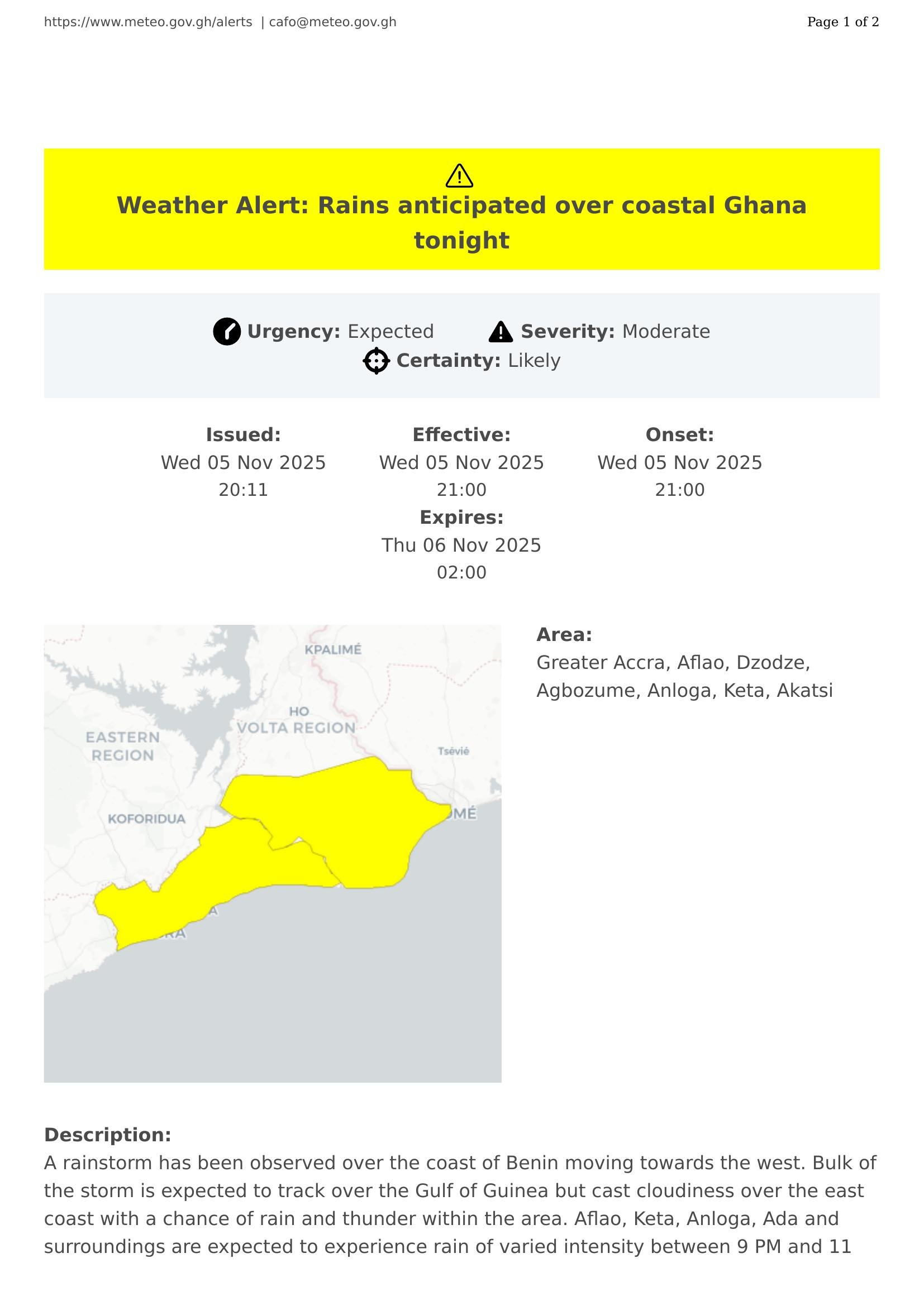 A rainstorm has been observed over the coast of Benin moving towards the west. Bulk of the storm is expected to track over the Gulf of Guinea but cast cloudiness over the east coast with a chance of rain and thunder within the area. Aflao, Keta, Anloga, Ada and surroundings are expected to experience rain of varied intensity between 9 PM and 11 PM. Other areas within Greater Accra region are also expected to experience similar conditions later in the night. There is already localized clouds producing pockets of rain within the regions.