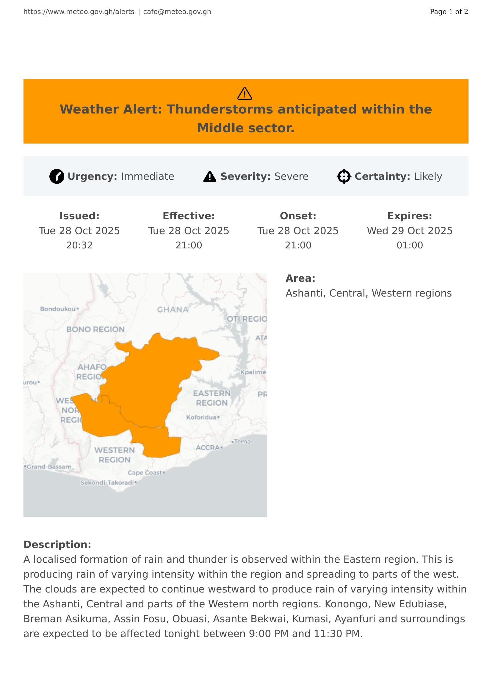 A localised formation of rain and thunder is observed within the Eastern region. This is producing rain of varying intensity within the region and spreading to parts of the west. The clouds are expected to continue westward to produce rain of varying intensity within the Ashanti, Central and parts of the Western north regions. Konongo, New Edubiase, Breman Asikuma, Assin Fosu, Obuasi, Asante Bekwai, Kumasi, Ayanfuri and surroundings are expected to be affected tonight between 9:00 PM and 11:30 PM.