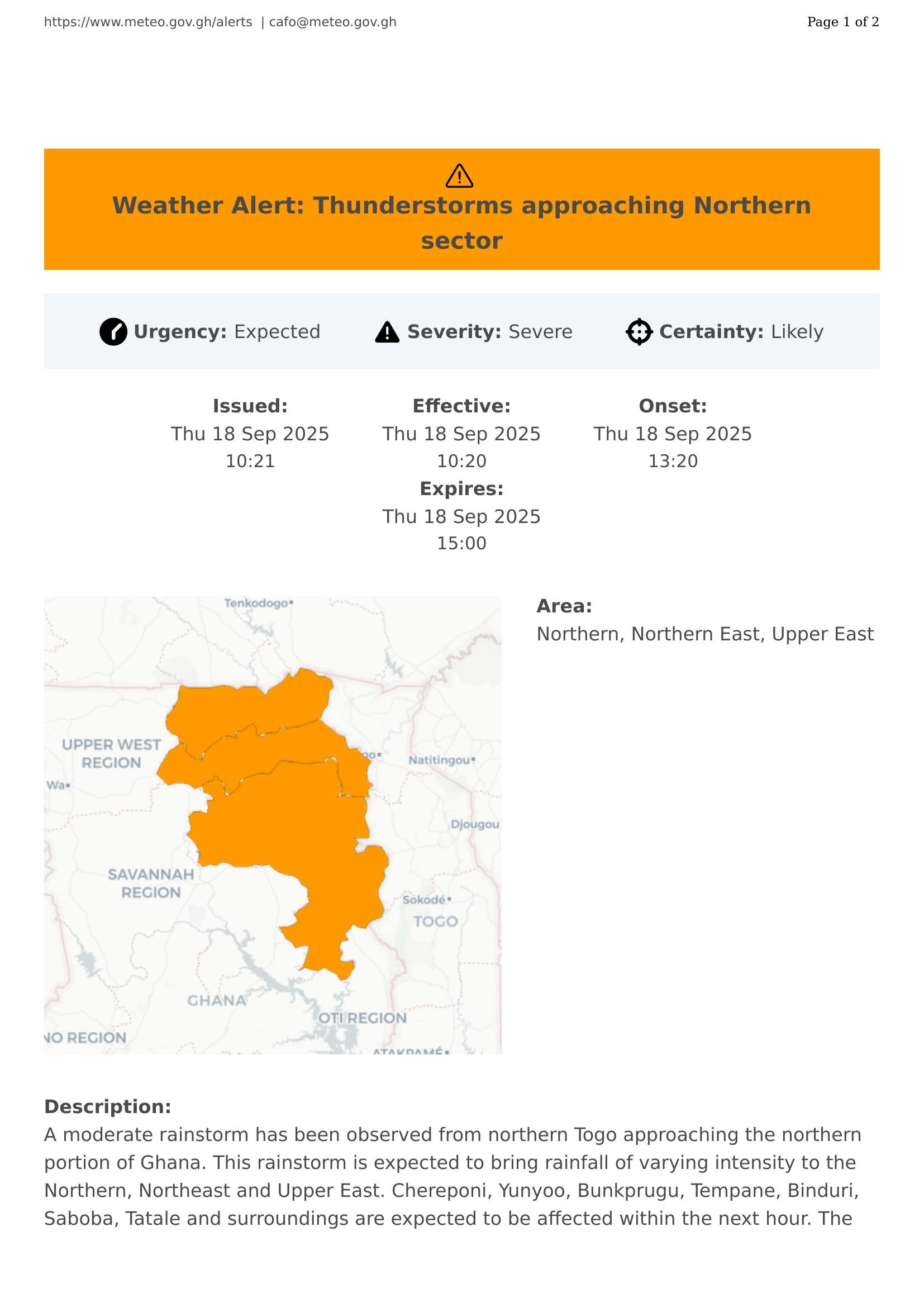A moderate rainstorm has been observed from northern Togo approaching the northern portion of Ghana. This rainstorm is expected to bring rainfall of varying intensity to the Northern, Northeast and Upper East. Chereponi, Yunyoo, Bunkprugu, Tempane, Binduri, Saboba, Tatale and surroundings are expected to be affected within the next hour. The rest of the regions are expected to experience similar conditions between 11 PM and 2 PM.