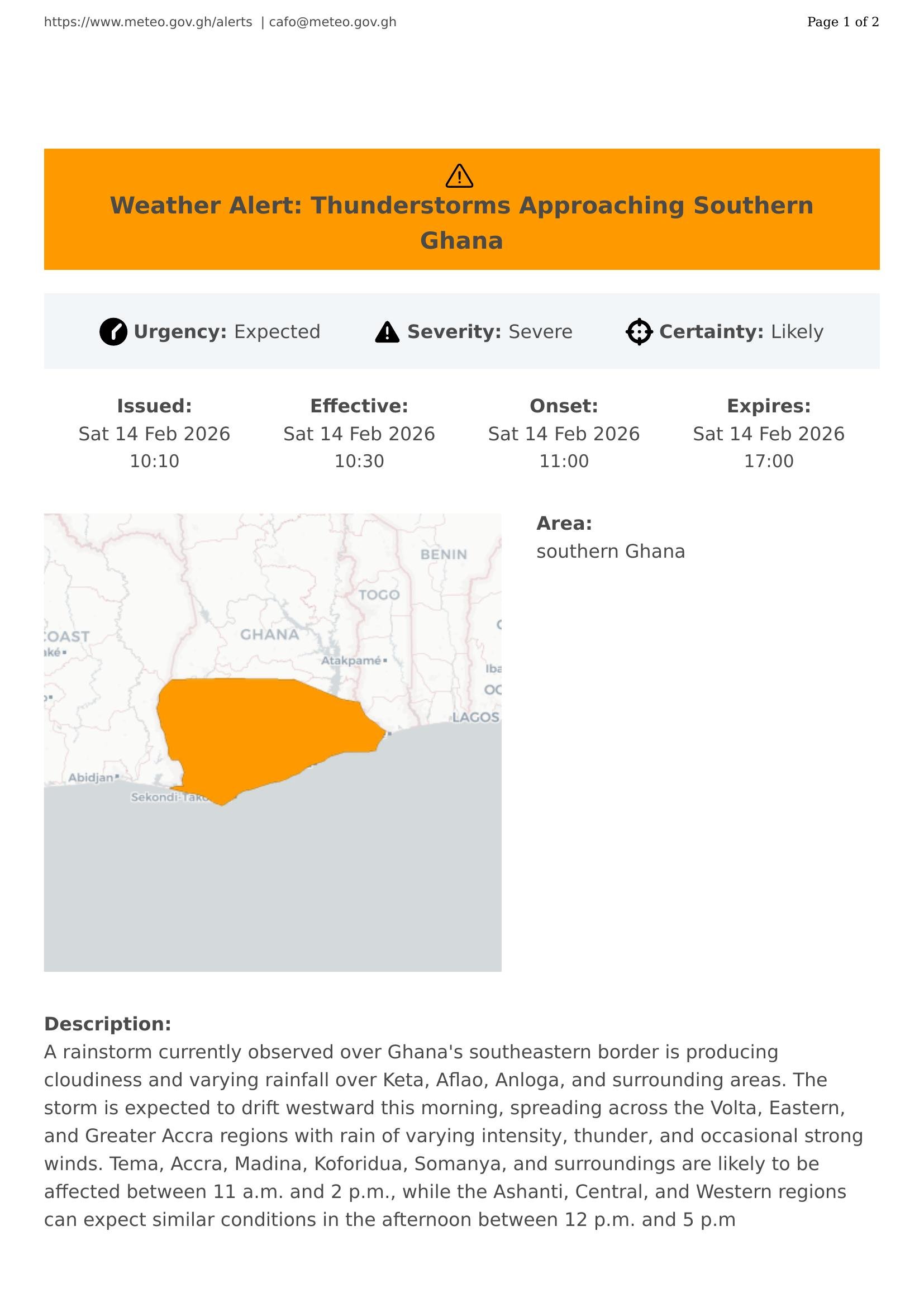 A rainstorm currently observed over Ghana's southeastern border is producing cloudiness and varying rainfall over Keta, Aflao, Anloga, and surrounding areas. The storm is expected to drift westward this morning, spreading across the Volta, Eastern, and Greater Accra regions with rain of varying intensity, thunder, and occasional strong winds. Tema, Accra, Madina, Koforidua, Somanya, and surroundings are likely to be affected between 11 a.m. and 2 p.m., while the Ashanti, Central, and Western regions can expect similar conditions in the afternoon between 12 p.m. and 5 p.m