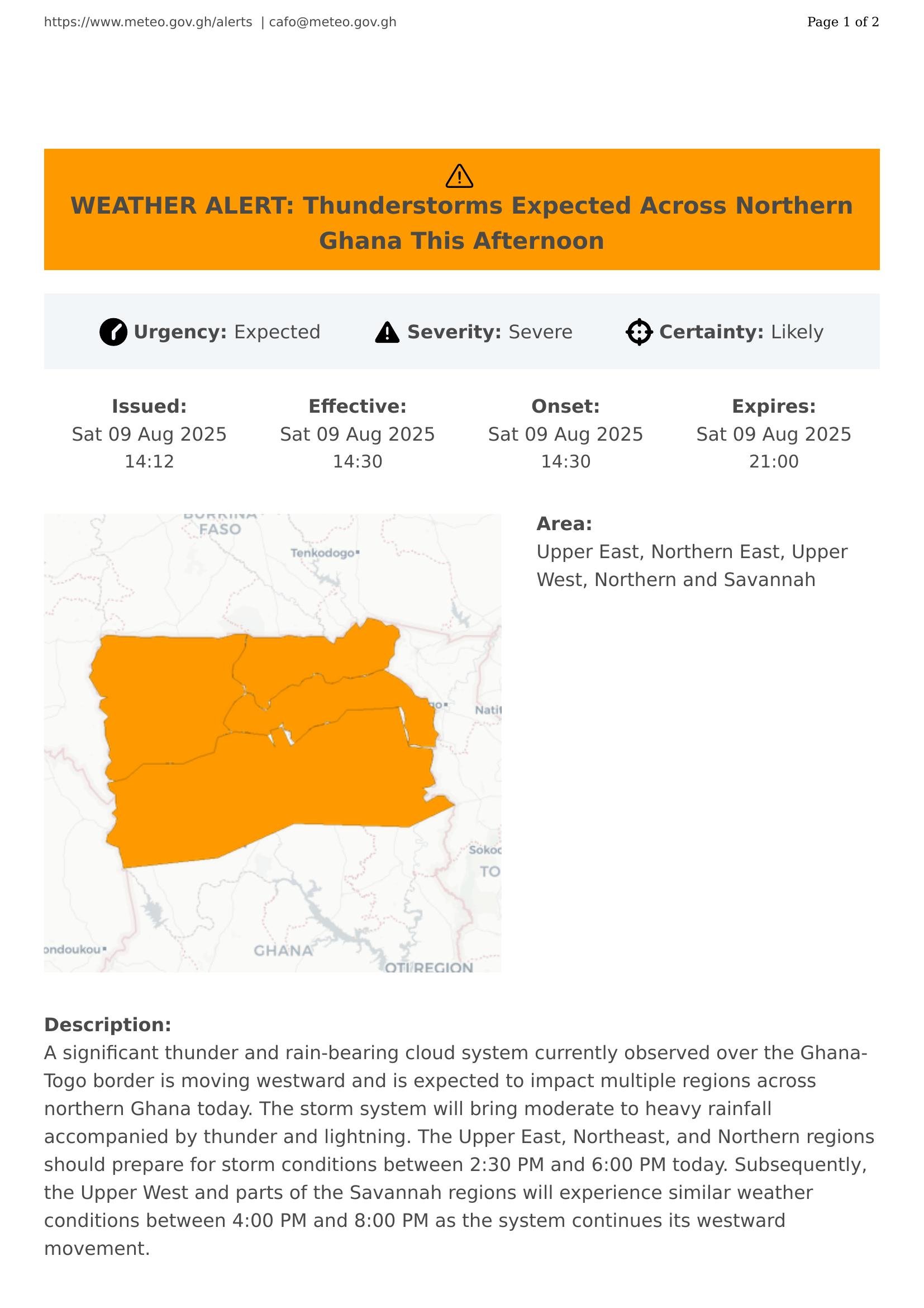A significant thunder and rain-bearing cloud system currently observed over the Ghana-Togo border is moving westward and is expected to impact multiple regions across northern Ghana today. The storm system will bring moderate to heavy rainfall accompanied by thunder and lightning. The Upper East, Northeast, and Northern regions should prepare for storm conditions between 2:30 PM and 6:00 PM today. Subsequently, the Upper West and parts of the Savannah regions will experience similar weather conditions between 4:00 PM and 8:00 PM as the system continues its westward movement.