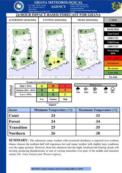 This afternoon, sunny weather with occasional cloudiness is expected over southern Ghana whereas the northern half will experience hot and sunny weather with slightly hazy conditions over the upper portions. However, from late afternoon into the night, localised rain bearing clouds will develop, producing thunderstorms or rain of varying intensities over parts of the middle and transition sectors (Oti, Volta, Eastern and Western regions).