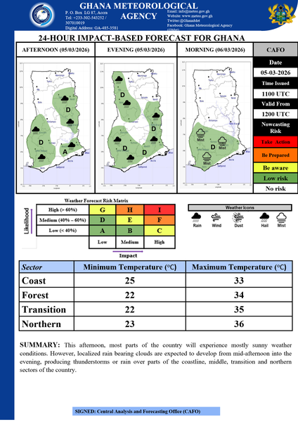 This afternoon, most parts of the country will experience mostly sunny weather conditions. However, localized rain bearing clouds are expected to develop from mid-afternoon into the evening, producing thunderstorms or rain over parts of the coastline, middle, transition and northern sectors of the country.