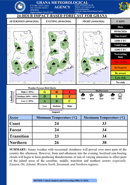 Sunny weather with occasional cloudiness will prevail over most parts of the country this afternoon. However, from mid-afternoon into the evening, localised rain-bearing clouds will begin to form producing thunderstorms or rain of varying intensities to affect parts of the inland areas of the coastline, middle, transition and northern sectors (especially, Eastern, Oti, Ashanti, Western North, Savannah, and Northern regions).