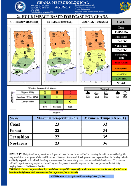 Bright and sunny weather will prevail over the southern half of the country this afternoon with slightly hazy conditions over parts of the middle sector. However, few cloud developments are expected later in the day, which are likely to produce localised thundery showers over few areas along the coastline and its inland areas. The northern half will experience varying intensities of dry and hazy conditions throughout the forecast period with visibility ranging between 3000m and 8000m.