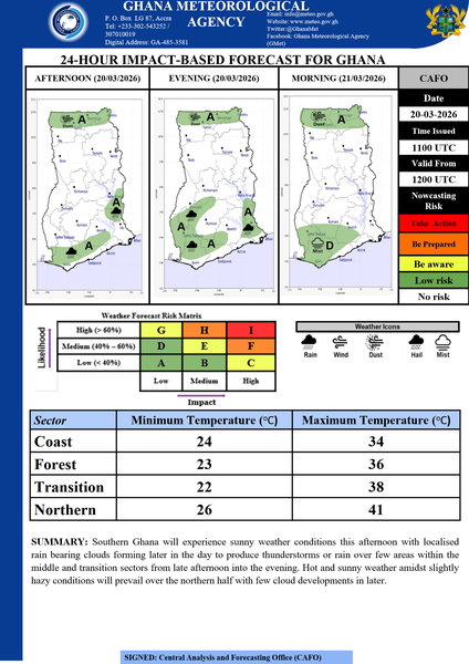 Southern Ghana will experience sunny weather conditions this afternoon with localised rain bearing clouds forming later in the day to produce thunderstorms or rain over few areas within the middle and transition sectors from late afternoon into the evening. Hot and sunny weather amidst slightly hazy conditions will prevail over the northern half with few cloud developments in later.