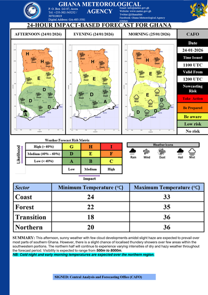 This afternoon, sunny weather with few cloud developments amidst slight haze are expected to prevail over most parts of southern Ghana. However, there is a slight chance of localised thundery showers over few areas within the southwestern portions. The northern half will continue to experience varying intensities of dry and hazy weather throughout the forecast period. Visibility is expected to range from 500m to 8000m.