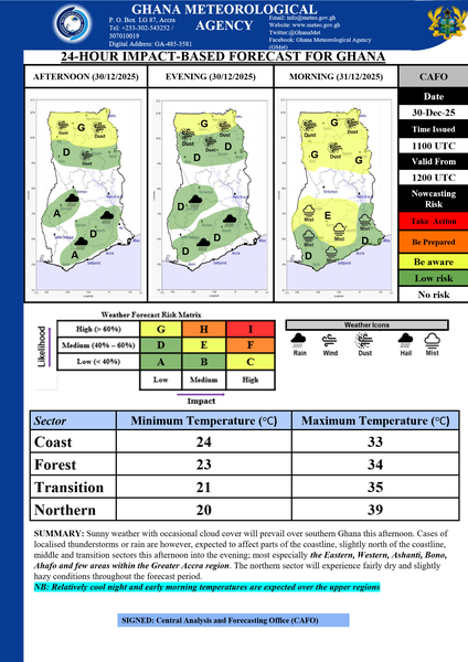 Sunny weather with occasional cloud cover will prevail over southern Ghana this afternoon. Cases of localised thunderstorms or rain are however, expected to affect parts of the coastline, slightly north of the coastline, middle and transition sectors this afternoon into the evening; most especially the Eastern, Western, Ashanti, Bono, Ahafo and few areas within the Greater Accra region. The northern sector will experience fairly dry and slightly hazy conditions throughout the forecast period.