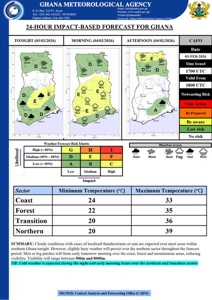 Cloudy conditions with cases of localised thunderstorms or rain are expected over most areas within southern Ghana tonight. However, slightly hazy weather will persist over the northern sector throughout the forecast period. Mist or fog patches will form early tomorrow morning over the coast, forest and mountainous areas, reducing visibility. Visibility will range between 500m and 8000m.
