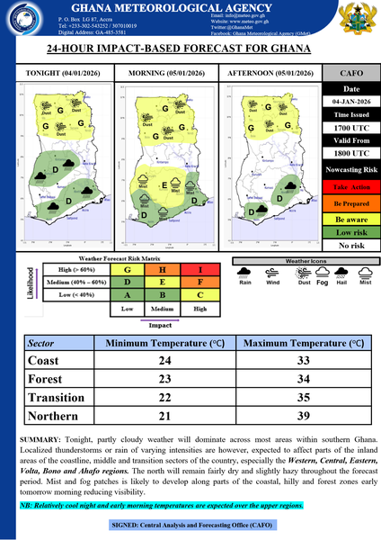 Tonight, partly cloudy weather will dominate across most areas within southern Ghana. Localized thunderstorms or rain of varying intensities are however, expected to affect parts of the inland areas of the coastline, middle and transition sectors of the country, especially the Western, Central, Eastern, Volta, Bono and Ahafo regions. The north will remain fairly dry and slightly hazy throughout the forecast period. Mist and fog patches is likely to develop along parts of the coastal, hilly and forest zones early tomorrow morning reducing visibility.