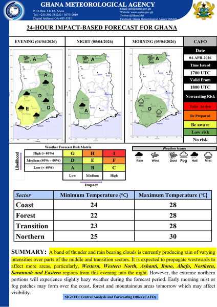 A band of thunder and rain bearing clouds is currently producing rain of varying intensities over parts of the middle and transition sectors. It is expected to propagate westwards to affect more areas, particularly, Western, Western North, Ashanti, Bono, Ahafo, Northern, Savannah and Eastern regions from this evening into the night. However, the extreme northern portions will experience slightly hazy weather during the forecast period. Early morning mist or fog patches may form over the coast, forest and mountainous areas tomorrow which may affect visibility.