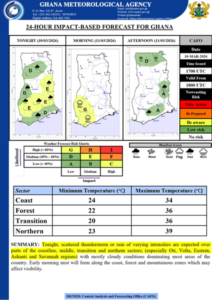 Tonight, scattered thunderstorm or rain of varying intensities are expected over parts of the coastline, middle, transition and northern sectors; (especially Oti, Volta, Eastern, Ashanti and Savannah regions) with mostly cloudy conditions dominating most areas of the country. Early morning mist will form along the coast, forest and mountainous zones which may affect visibility.
