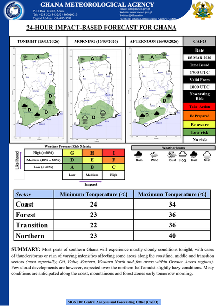 "Most parts of southern Ghana will experience mostly cloudy conditions tonight, with cases of thunderstorms or rain of varying intensities affecting some areas along the coastline, middle and transition sectors (most especially, Oti, Volta, Eastern, Western North and few areas within Greater Accra regions). Few cloud developments are however, expected over the northern half amidst slightly hazy conditions. Misty conditions are anticipated along the coast, mountainous and forest zones early tomorrow morning. "