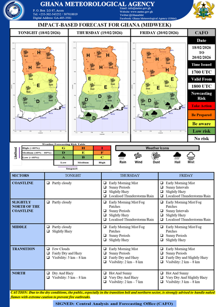 Partly cloudy conditions will prevail over most parts of southern Ghana tonight amidst slightly hazy conditions over the middle sector. Dry and hazy conditions will be persistent over the transition belt and northern sector throughout the forecast period. Mist or fog patches will form along the coast, forested and mountainous areas in the early hours of the morning. Visibility range throughout the forecast period is expected to be between 1km and 8Km.