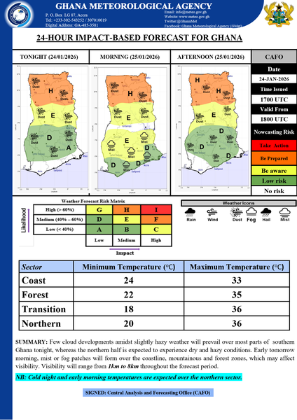 Few cloud developments amidst slightly hazy weather will prevail over most parts of southern Ghana tonight, whereas the northern half is expected to experience dry and hazy conditions. Early tomorrow morning, mist or fog patches will form over the coastline, mountainous and forest zones, which may affect visibility. Visibility will range from 1km to 8km throughout the forecast period.
