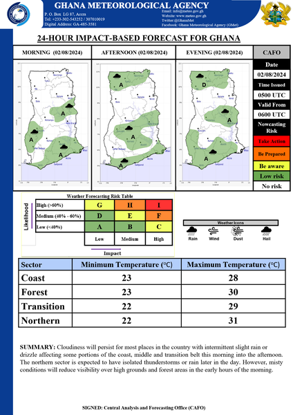 drizzle affecting some portions of the coast, middle and transition belt this morning into the afternoon. The northern sector is expected to have isolated thunderstorms or rain later in the day. However, misty conditions will reduce visibility over high grounds and forest areas in the early hours of the morning.