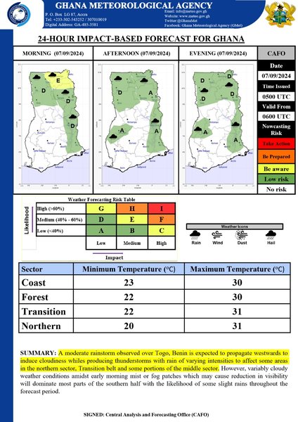 A moderate rainstorm over Togo, Benin is to westwards to induce with rain of varying intensities to affect some areas in the northern sector, transition belt and some portions of the middle sector. However, variably cloudy weather conditions amidst early morning mist or fog patches which may cause reduction in visibility will dominate most parts of the southern half with the likelihood of some slight rains throughout the forecast period.