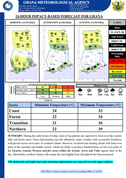 During the early hours of today, mist or fog patches are expected to form over the coastal, hilly and forest zones. From mid-morning into the afternoon, sunny weather with occasional cloudiness will prevail across most parts of southern Ghana. However, localised rain bearing clouds will form over parts of the coastline and middle sectors, which are likely to produce thunderstorms or rain over parts of the Eastern, Central, Western and few areas within the Greater Accra and Volta regions later in the day. Meanwhile, northern Ghana will remain dry and slightly hazy throughout the forecast period.