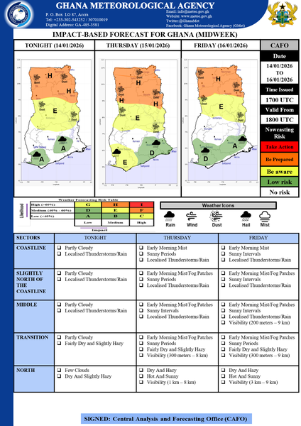 Sunny weather will prevail over most areas within southern Ghana during the afternoon hours on Thursday and Friday. However, cases of thunderstorms or rain are expected to affect parts of the coastline and middle sectors from late afternoon into the evening hours of Thursday and Friday. Dry and hazy weather will persist over parts of the middle, transition and northern sectors throughout the forecast period with visibility ranging from 1km to 8km.