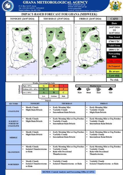 Variably cloudy weather is anticipated for the forecast period with slight rain or drizzle expected to affect the transition belt down south to the coastline. However, the northern sector is expected to have isolated thunderstorms or rai.