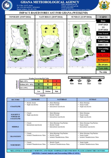 Mostly Cloudy weather is anticipated for the weekend with intermittent rain or drizzle for southern Ghana whereas the northern sector experiences Scattered thunderstorms or rain