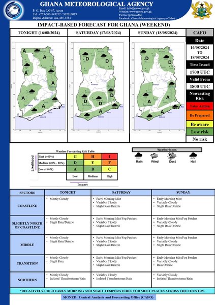 Mostly cloudy weather is expected with cases of slight rain or drizzle over southern Ghana whereas the northern sector experiences isolated thunderstorms or rain.